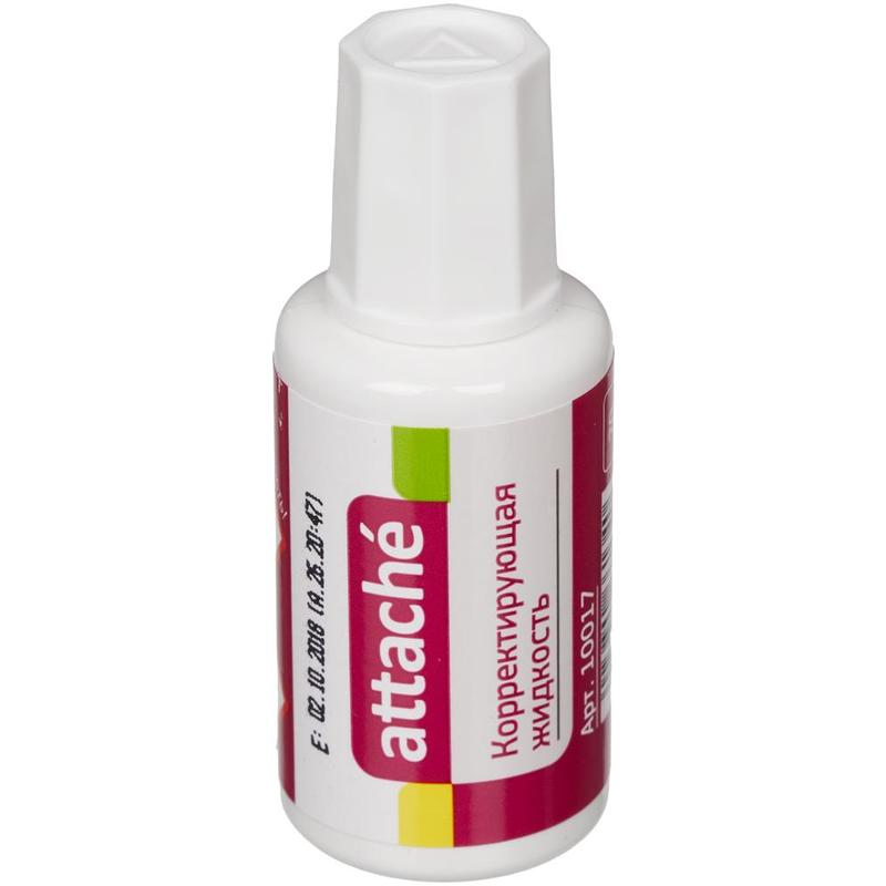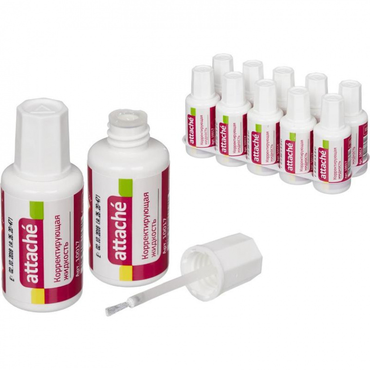 Корректирующая жидкость Attache применяется для корректировки всех типов документов, включая бумагу для факсов. Ложится ровным гладким слоем, создает непрозрачное покрытие. Имеет быстросохнущую основу. Во флаконе есть металлический шарик (перед использованием рекомендуется встряхивать). Вид кисточки — ворс. Объем флакона с корректирующей жидкостью составляет 20 мл.