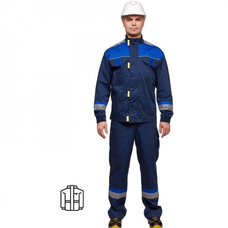 Спецодежда летняя куртка л24-КУ (размер 44-46, рост 170-176) синего цвета с васильковыми вставками. Летняя куртка изготовлена из смесовой ткани (35% хлопок, 65% полиэфир) плотностью 240 г/м2. Куртка прямого силуэта, укороченная, на молнии с ветрозащитным клапаном, застегивающимся на контактную ленту. Наличие 4 накладных карманов: 2 верхних с клапанами, 2 нижних с косым входом. Светоотражающая полоса расположена на рукавах, по плечевым швам, спине. Рукава на манжете с резинкой и усилениями в области локтевого шва. Воротник стойка. Куртка рекомендована к использованию в промышленности (автомобильной, логистике, транспорте). Соответствует ГОСТ 27575-87.