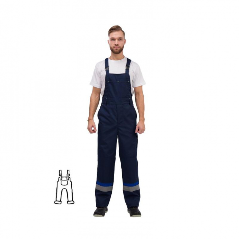 Спецодежда летняя полукомбинезон л24-ПК (размер 44-46, рост 170-176) синего цвета. Летний полукомбинезон изготовлен из смесовой ткани (35% хлопок, 65% полиэфир) плотностью 240 г/м2. Полукомбинезон прямого силуэта. По задней части полукомбинезона по талии — резинка. На грудке наличие кармана. Усиление в области колен. На каждой брючине светоотражающая полоса шириной 50 мм. Полукомбинезон рекомендован к использованию в промышленности (автомобильной, логистике, транспорте). Соответствует ГОСТ 27575-87.