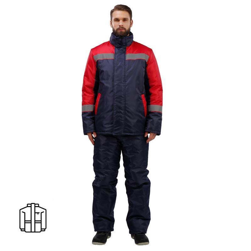 Спецодежда зимняя куртка мужская з38-КУ (размер 48-50, рост 170-176) синего цвета с красными вставками. Изготовлена из ткани 'Оксфорд' (100% полиэстер), плотность ткани - 110 г/кв.м. Утеплитель - синтепон, плотность -120 г/кв.м (3 слоя). Материал подкладки - 100% полиэстер. Модель куртки с центральной застежкой на молнию и ветрозащитным клапаном на липучке. Боковые карманы на молнии. Светоотражающая полоса шириной 5 см размещена на груди, спине, рукавах. Куртка обеспечивает защиту от пониженных температур и производственных загрязнений. Рекомендована для использования в строительстве. ТР ТС 019/2011, ГОСТ 12.4.303-2016.В коллекции зимней спецодежды з38 представлены куртки и полукомбинезоны в нескольких цветовых решениях: куртки з38-КУ голубого цвета с черной отделкой и красно-черной цветовой гамме и полукомбинезоны з38-ПК в темно-синем и черном цвете. К куртке з38-КУ в синем цвете с красными элементами подходит полукомбинезон з38-ПК темно-синего цвета.