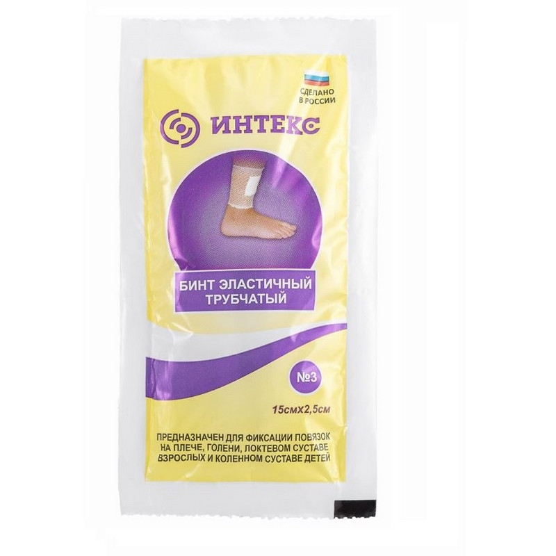 Бинт №3 трубчатый 'ИНТЕКС' используют для фиксации повязок. Бинты обладают хорошей эластичностью, поэтому растягиваются до нужных размеров и надежно обхватывают место перевязки. Индивидуальная упаковка бинтов 'ИНТЕКС' изготавливается из пленки ПВХ и содержит маркировку на каждой штуке, упаковка водостойкая и защищает бинты от повреждений при транспортировке и хранении. 1 упаковка включает в себя 20 штучных бинтов. Бинт № 3 предназначен для фиксации сухих и влажных повязок на плече, голени, локтевом суставе взрослых и коленном суставе детей. По всей длине бинтов №3 нанесена маркерная полоса бежевого цвета, которая предназначена для правильной ориентации бинта по оси при наложении его на тело, с целью предотвращения перекручивания бинтов при их использовании. Перед вскрытием убедитесь, что срок годности трубчатого бинта №3 не просрочен, если срок годности хороший - вскройте разовую упаковку. Достаньте из упаковки трубчатый бинт 'ИНТЕКС' №3 и аккуратно натяните его на место, где закреплена фиксируемая салфетка или повязка. После чего, займитесь распределением трубчатого бинта №3 по окружности места травмы так, чтобы осевые нити сетки были прямыми. Следите за маркерной полосой на поверхности бинта, она не должна перекручиваться.