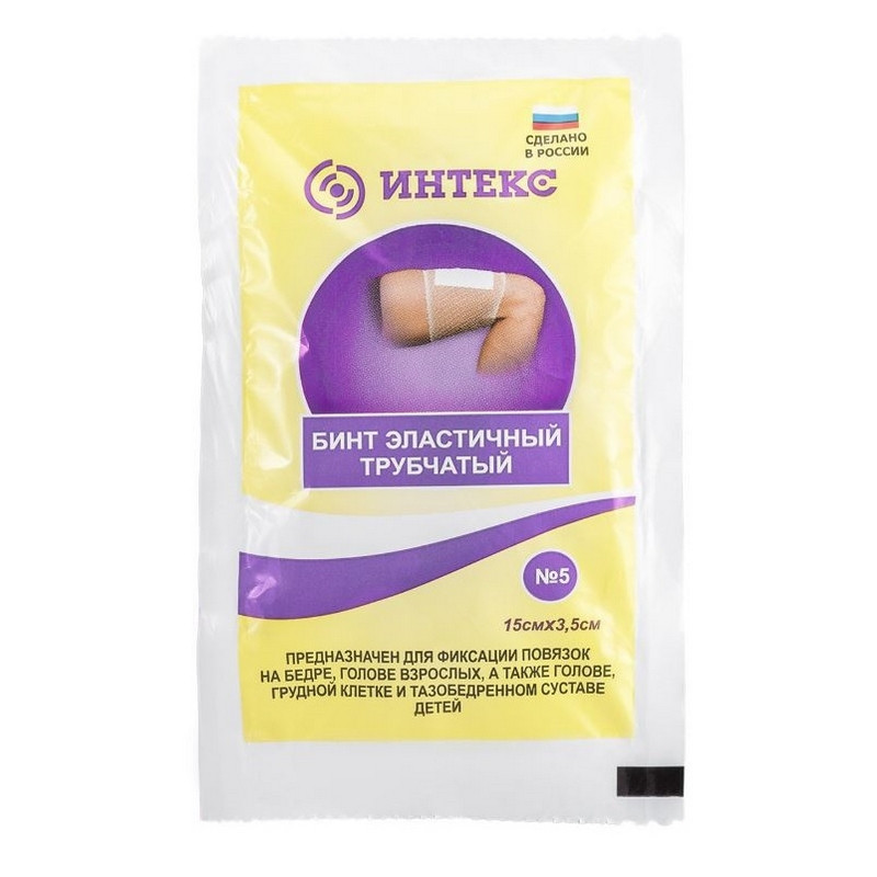 Бинт №5 трубчатый 'ИНТЕКС' используют для фиксации повязок. Бинты обладают хорошей эластичностью, поэтому растягиваются до нужных размеров и надежно обхватывают место перевязки. Индивидуальная упаковка бинтов 'ИНТЕКС' изготавливается из пленки ПВХ и содержит маркировку на каждой штуке, упаковка водостойкая и защищает бинты от повреждений при транспортировке и хранении. 1 упаковка включает в себя 20 штучных бинтов. Бинт № 5 предназначен для фиксации сухих и влажных повязок на коленном суставе взрослых, голове, грудной клетке, а также тазобедренном суставе детей. По всей длине бинтов №5 нанесена маркерная полоса бежевого цвета, которая предназначена для правильной ориентации бинта по оси при наложении его на тело, с целью предотвращения перекручивания бинтов при их использовании. ПОРЯДОК ИСПОЛЬЗОВАНИЯ: Перед вскрытием убедитесь, что срок годности трубчатого бинта №5 не просрочен, если срок годности хороший - вскройте разовую упаковку. Достаньте из упаковки трубчатый бинт 'ИНТЕКС' №5 и аккуратно натяните его на место, где закреплена фиксируемая салфетка или повязка. После чего, займитесь распределением трубчатого бинта №5 по окружности места травмы так, чтобы осевые нити сетки были прямыми. Следите за маркерной полосой на поверхности бинта, она не должна перекручиваться.
