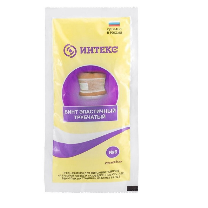Бинт №6 трубчатый 'ИНТЕКС' используют для фиксации повязок. Бинты обладают хорошей эластичностью, поэтому растягиваются до нужных размеров и надежно обхватывают место перевязки. Индивидуальная упаковка бинтов 'ИНТЕКС' изготавливается из пленки ПВХ и содержит маркировку на каждой штуке, упаковка водостойкая и защищает бинты от повреждений при транспортировке и хранении. 1 упаковка включает в себя 20 штучных бинтов. Бинт № 6 предназначен для фиксации сухих и влажных повязок на грудной клетке и тазобедренном суставе взрослых. По всей длине бинтов №6 нанесена маркерная полоса бежевого цвета, которая предназначена для правильной ориентации бинта по оси при наложении его на тело, с целью предотвращения перекручивания бинтов при их использовании. ПОРЯДОК ИСПОЛЬЗОВАНИЯ: Перед вскрытием убедитесь, что срок годности трубчатого бинта №6 не просрочен, если срок годности хороший - вскройте разовую упаковку. Достаньте из упаковки трубчатый бинт 'ИНТЕКС' №6 и аккуратно натяните его на место, где закреплена фиксируемая салфетка или повязка. После чего, займитесь распределением трубчатого бинта №6 по окружности места травмы так, чтобы осевые нити сетки были прямыми. Следите за маркерной полосой на поверхности бинта, она не должна перекручиваться.