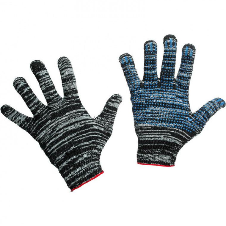 Перчатки защитные трикотажные предназначены для защиты рук от мелких механических повреждений и общих производственных загрязнений. Рабочие перчатки изготовлены из хлопчатобумажной пряжи с покрытием точка из поливинилхлорида с нанесением рисунка на внутреннюю сторону перчатки. Покрытие ПВХ помогает обеспечить плотный захват и предотвращают соскальзывание детали. Перчатки трикотажные с манжетой на резинке обеспечивают плотное прилегание перчатки к руке. Оптимальны для складских, садовых и ремонтных работ. Положите их в автомобиль и, в случае необходимости, вы защитите свои руки от травм и грязи. Основа: 70% хлопок, 30% полиэфир. Материал и рисунок покрытия: ПВХ, точка.