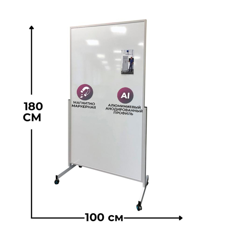 Доска мобильная информационная. Прочная базовая модель с высокой устойчивостью. Универсальна: может использоваться в качестве разделительной панели. Поверхность доски: металлический лист с лаковым покрытием, подходит для магнитов и использования маркеров сухого стирания. Подходит для использоваться людьми с невысоким ростом. Также на ней можно писать, сидя на стуле, или людям с ограниченными возможностями (можно подъехать на инвалидной коляске, рабочая поверхность не будет слишком высоко, как у обычных мобильных напольных досок). Для удаления пленки потяните за верхний свободный угол, пленка легко отойдет от рабочей поверхности. При необходимости проведите вдоль рамы канцелярским ножом.