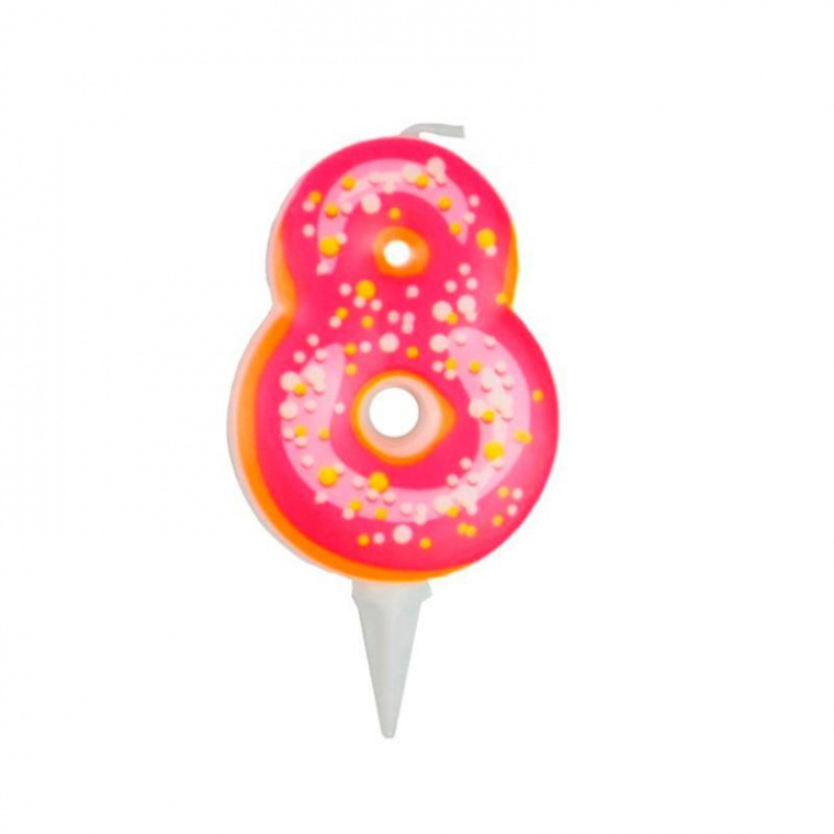 Свеча для торта «Пончик». У каждой цифры из коллекции свой дизайн — восьмерку украшают клубничная глазурь и ванильная крошка! Размер: 6 см.