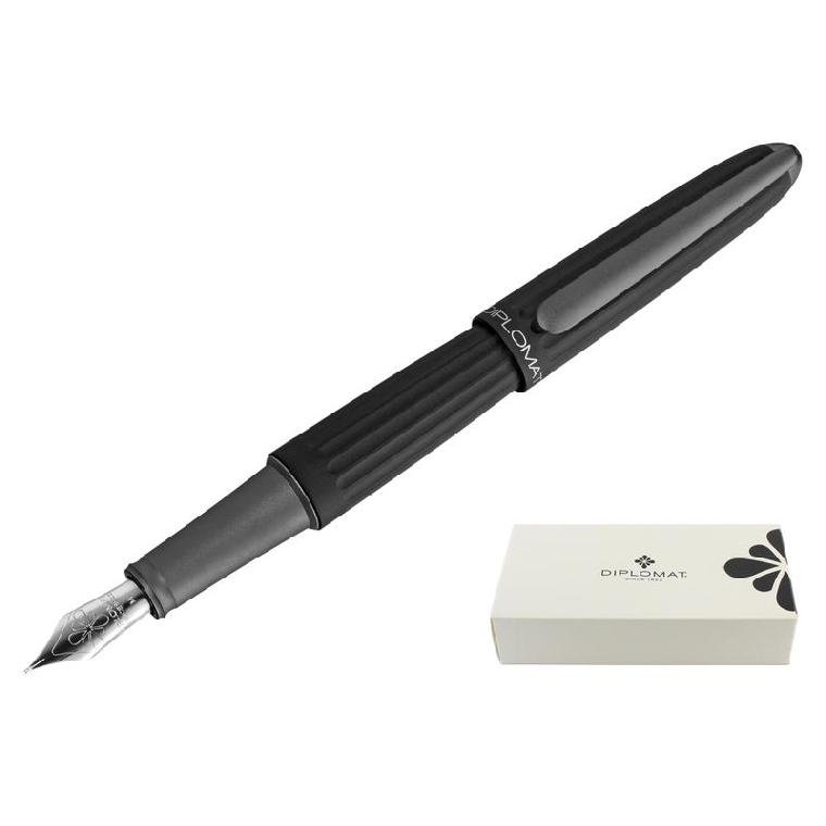 Diplomat Aero — это оригинальная серия пишущих инструментов, с запоминающимся и узнаваемым дизайном. Вдохновением для создания коллекции стал легендарный дирижабль Цеппелин 1900 года, осуществивший свой первый полет 2 июля над Боденским озером недалеко от города Фридрихсхафен под руководством самого графа Фердинанда фон Цеппелина. Именно поэтому, необычная форма ручек Aero своим обтекаемым корпусом с рельефными бороздками так напоминает дирижабль. Корпус перьевой ручки Diplomat Aero Black выполнен из анодированного алюминия в матовом черном цвете, имеет в меру тяжелый вес и удобный захват. Благодаря эргономичному дизайну, отличной сбалансированности и не скользящей зоне захвата — ручка удобно лежит в руке. Перо выполнено из отполированной нержавеющей стали, с оригинальной гравировкой в виде логотипа и надписи «Diplomat Since 1922», идеально скользит по бумаге. Съемный колпачок имеет внутреннюю пластиковую вставку, предотвращающую высыхание чернил, надежно фиксируется на ручке с ощутимым щелчком. Торец колпачка украшен логотипом бренда в виде цветка.