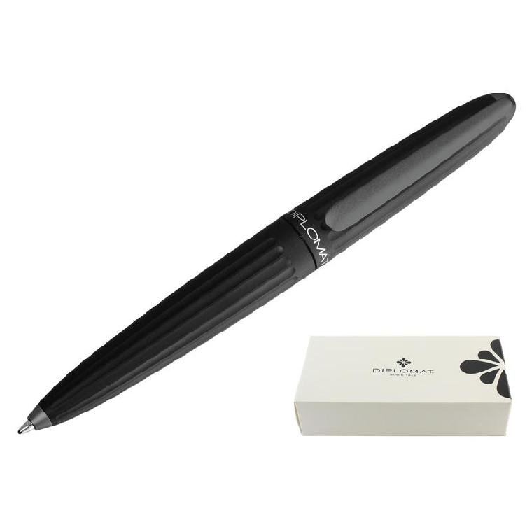 Diplomat Aero — это оригинальная серия пишущих инструментов, с запоминающимся и узнаваемым дизайном. Вдохновением для создания коллекции стал легендарный дирижабль Цеппелин 1900 года, осуществивший свой первый полет 2 июля над Боденским озером недалеко от города Фридрихсхафен под руководством самого графа Фердинанда фон Цеппелина. Шариковая ручка Diplomat Aero Black выполнена из анодированного алюминия в матовом черном цвете, имеет в меру тяжелый вес. Обтекаемый корпус с рельефными бороздками, напоминает форму дирижабля. Дизайн завершает логотип бренда в виде цветка на торце ручки. Благодаря эргономичному дизайну и отличной сбалансированности — ручка комфортно лежит в руке. Стержень в ручке обеспечивает гладкое и легкое письмо.