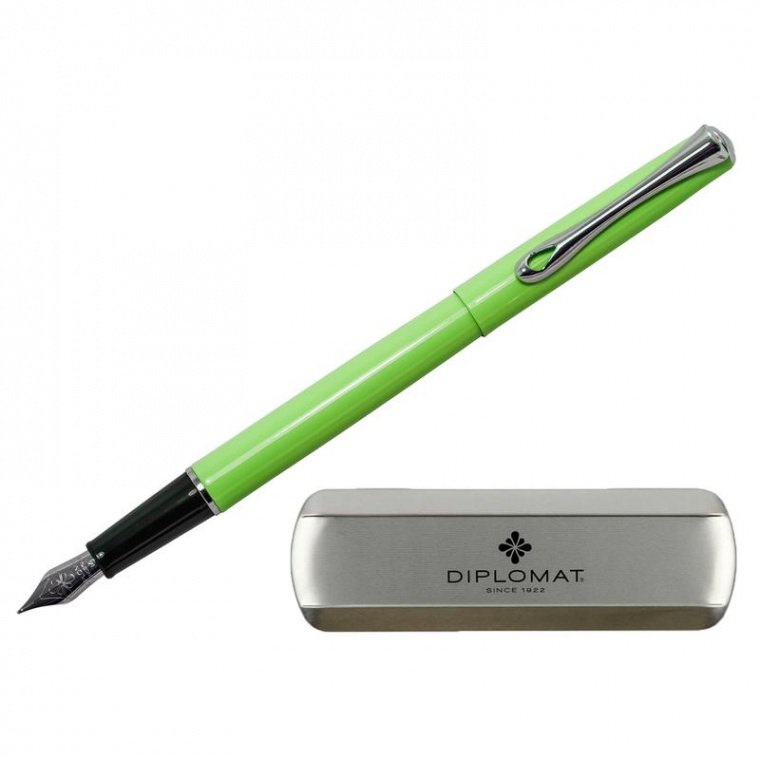 Серия Traveller от Diplomat — это тонкие элегантные письменные принадлежности высокого качества. Корпус перьевой ручки Diplomat Traveller Lumi Green выполнен из нержавеющей стали с лаковым глянцевым покрытием салатового цвета, приятный контраст придают хромированные детали отделки. Зона захвата изготовлена из черного блестящего пластика. Перо из нержавеющей стали украшено оригинальной гравировкой с логотипом бренда в виде цветка и надписью «Diplomat Since 1922». Отличительные особенности дизайна включают в себя также изогнутый клип и логотип Diplomat, расположенный на торце колпачка ручки. Все это придет свежий и современный облик данному пишущему аксессуару. Тонкий диаметр 9-10 мм идеально подходит для петель органайзера, а также комфортного ношения ручки при себе в кармане пиджака. Пишущие инструменты Diplomat изготавливаются и тестируются вручную, с использованием традиционных методов мастерства с 1922 г., отвечая принятому стандарту качества «сделано в Германии».