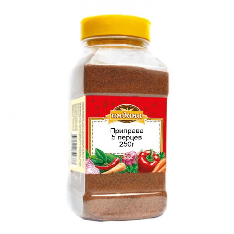 Приправа 5 перцев «Индана» — это уникальная смесь перцев, выращенных на разных континентах мира. Пять основных видов перца придают блюдам необыкновенный аромат, остроту и изысканный вкус. Смесь из пяти перцев — это классическая приправа, поэтому ее применение в кулинарии многообразно: в мясных, рыбных, грибных, овощных первых и вторых блюдах, блюдах из птицы, дичи и соусах.