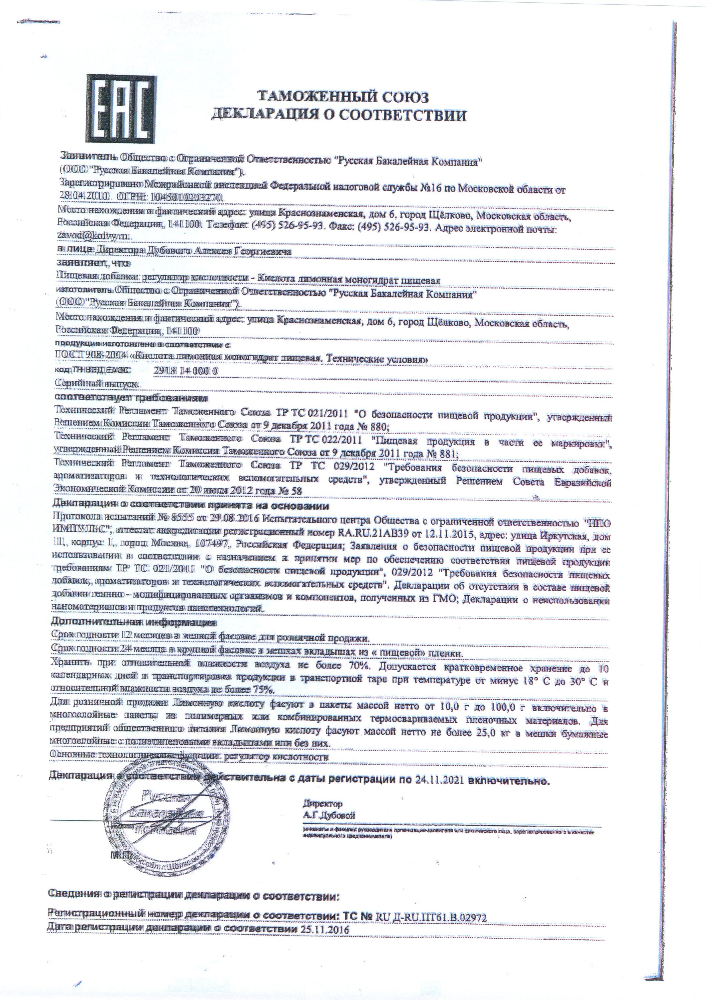 Лимонная кислота «Индана». При добавлении ее в тесто или другие блюда пища обретает кисло-сладкое послевкусие. Лимонка выступает в качестве состава, предотвращающего окислительные процессы. При умеренном потреблении кислота безопасна и очень полезна.