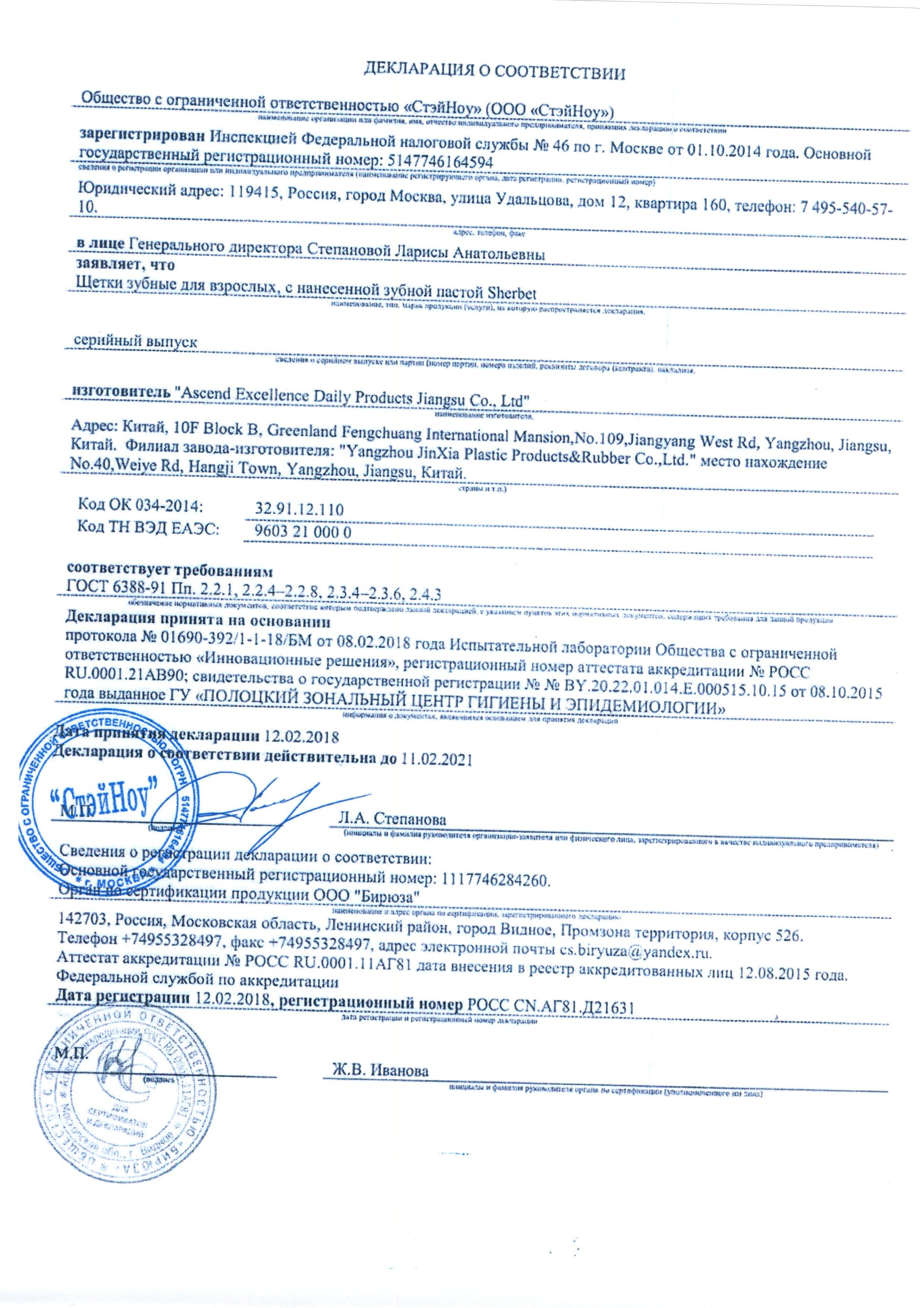 Одноразовые зубные щетки Sherbet «Мятный мусс» с ксилитолом предназначены для проведения ежедневных процедур комплексной гигиены полости рта. Каждая щетка имеет щетину средней жесткости и упакована в гигиеничный пакетик с маркировкой. На каждую одноразовую зубную щетку уже нанесена зубная паста, поэтому при первой чистке зубов, использование дополнительных чистящих средств не требуется. Несмотря на то, что щетки называются одноразовыми, после первого применения, вы можете использовать их как обычную мануальную зубную щетку — чистить зубы с применением зубной пасты по 2 минуты дважды в день. Зубные щетки Sherbet рекомендуются к применению в стоматологических клиниках для применения перед осмотром или лечением, в гостиницах, а также в повседневной жизни — для чистки зубов дома и в офисе, в поездке, после приема пищи или перед важной встречей. Зубная паста, нанесенная на щетку, не содержит фтор. Одноразовые зубные щетки Sherbet можно использовать без воды, что очень удобно для лежачих больных.