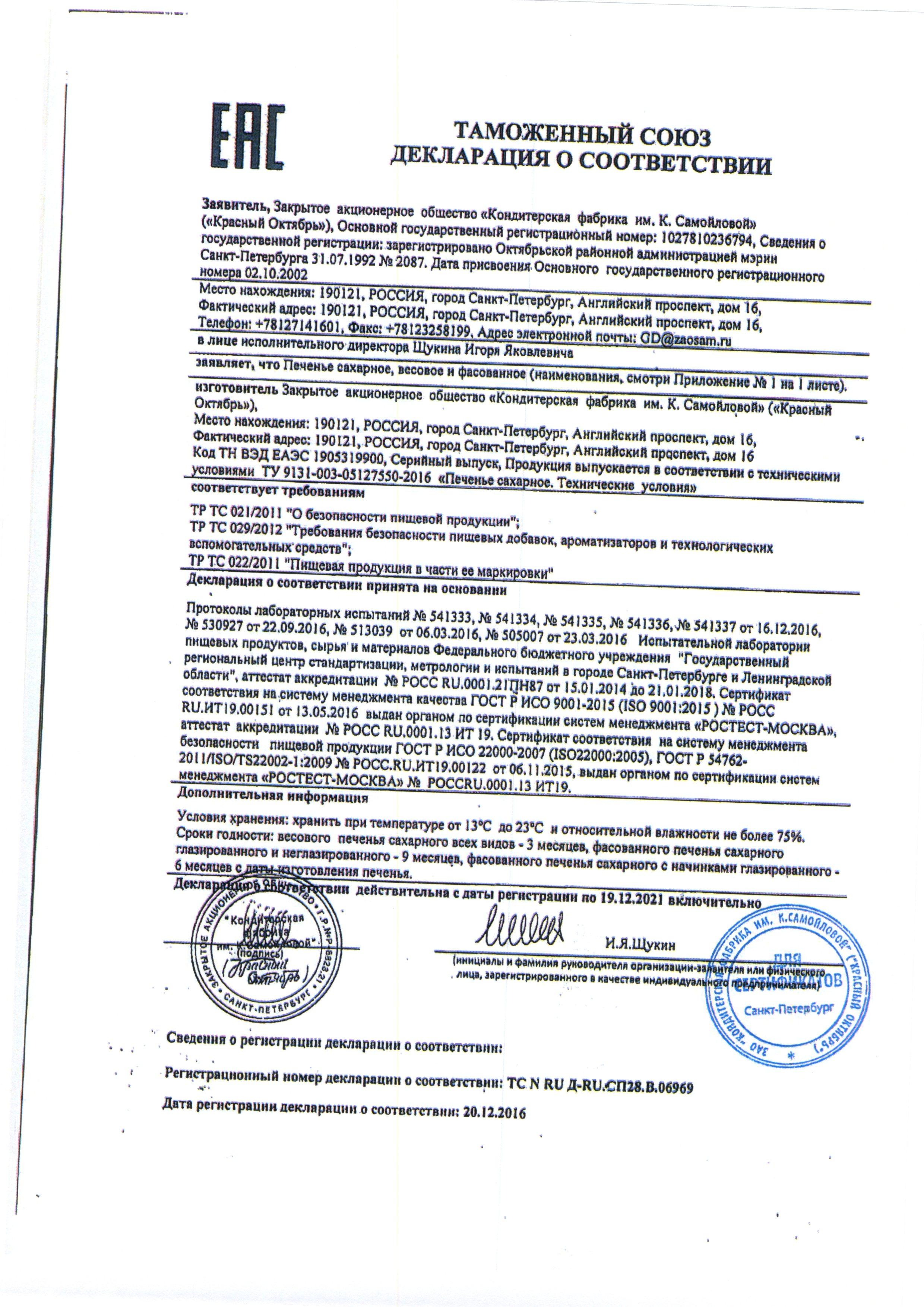 Состав: мука пшеничная общего назначения, сахар, жир кондитерский гидрогенизированный (рафинированные, дезодорированные растительные масла (пальмовое, подсолнечное), антиокислитель — Е306), вода питьевая, меланж сухой яичный, сгущенное с сахаром молоко (цельное молоко, сахар), крахмал кукурузный, соль, ароматизатор «Топленое молоко», разрыхлитель- гидрокарбонат натрия, регулятор кислотности- молочная кислота.