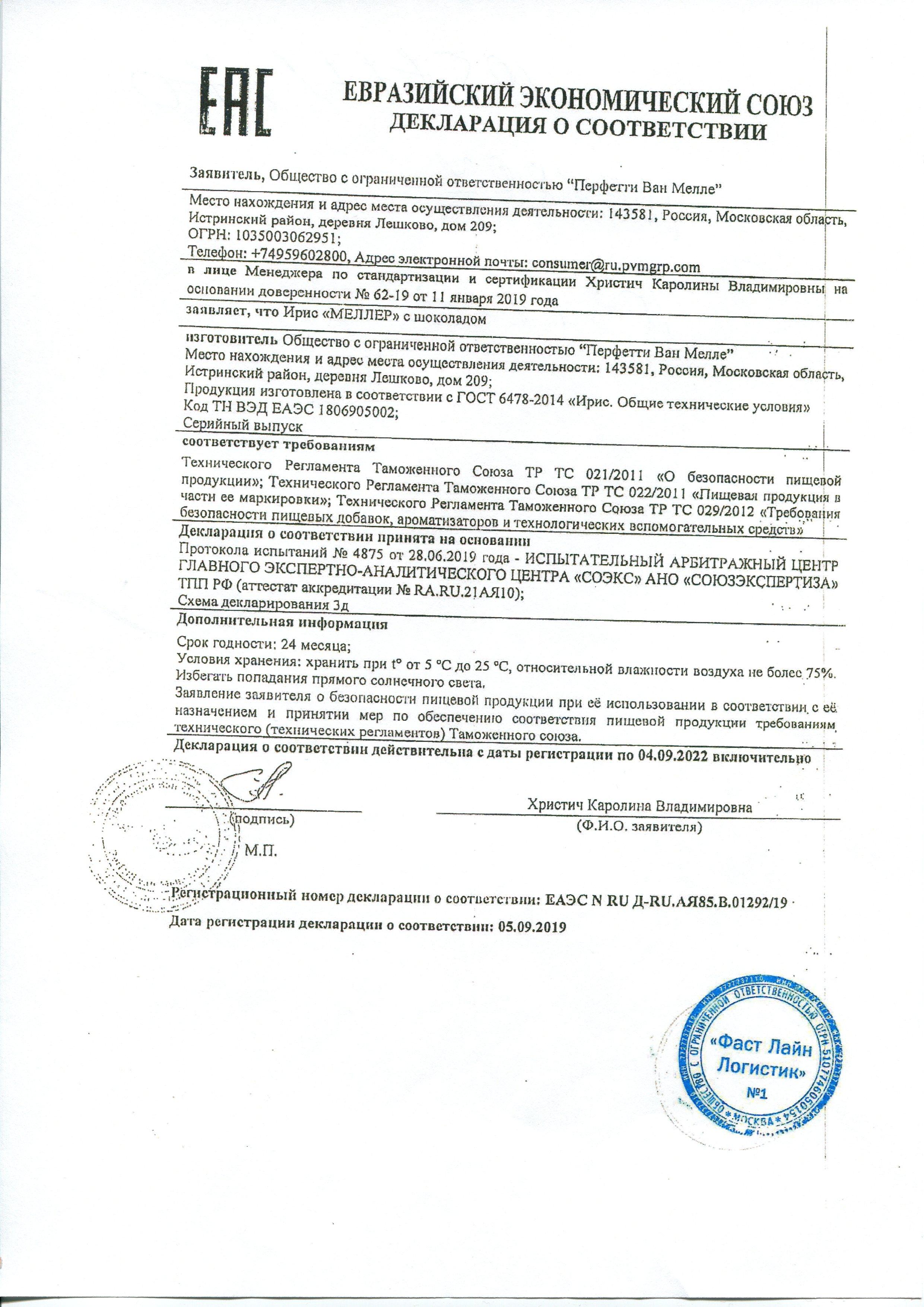 Сертификат на товар - Ирис Meller Шоколад 38 г (24 штуки в упаковке)