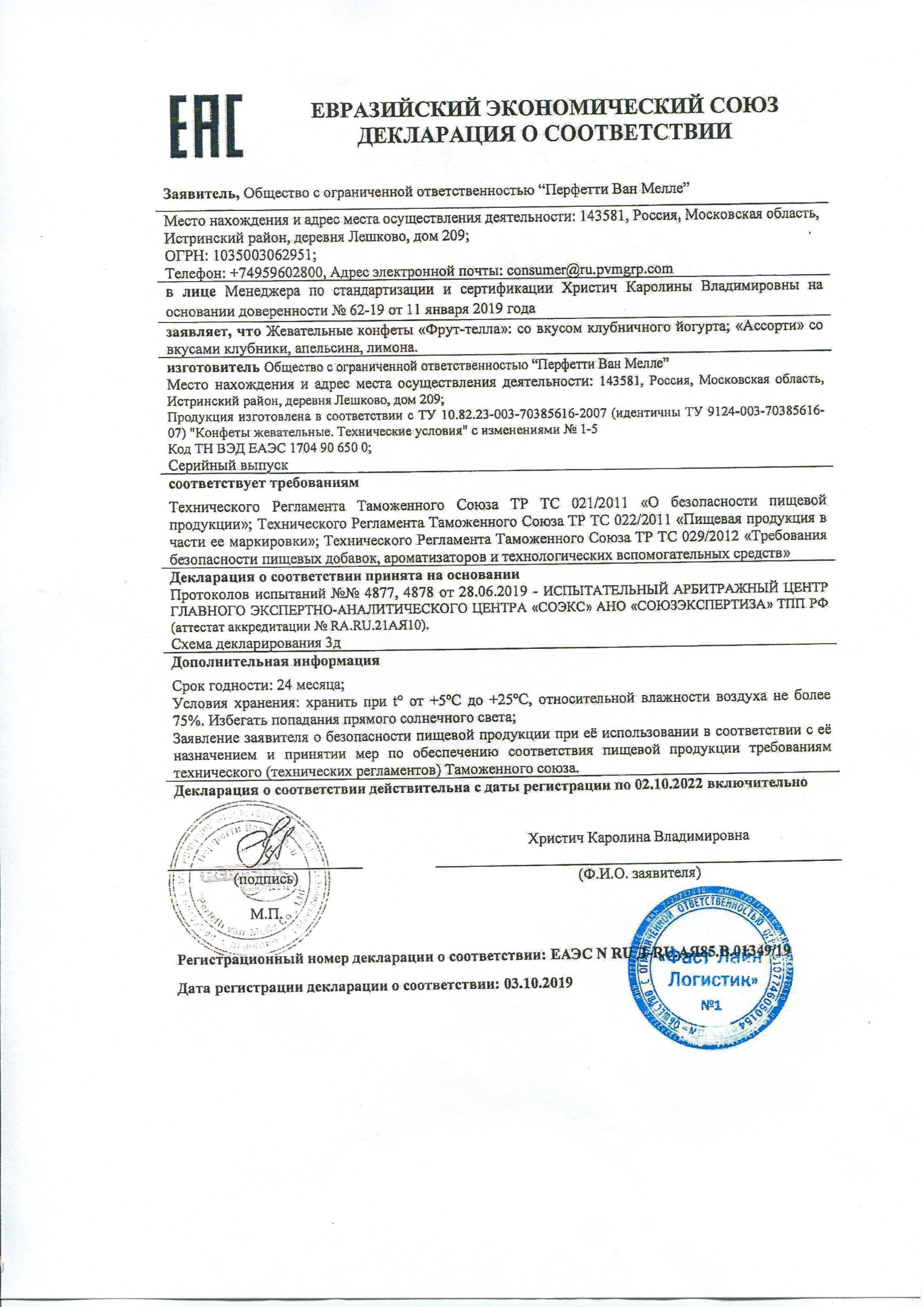 Сертификат на товар - Конфеты жевательные Fruittella Ассорти 41 г (21 штука в упаковке)