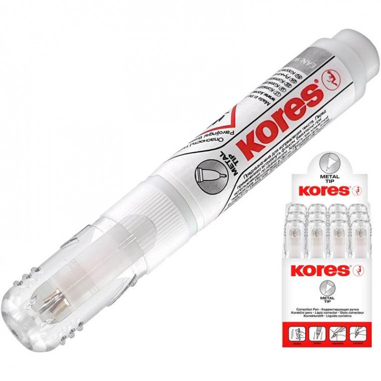 Корректирующая ручка Kores имеет металлический наконечник и подходит для корректировки толстых линий. Флакон оснащен шариком для лучшего смешивания и достижения однородной консистенции жидкости. Корректор быстро сохнет на бумаге и отлично закрашивает текст. Подходит для всех типов чернил и печатного текста. Объем флакона 10 г (8 мл). Страна: Чехия.