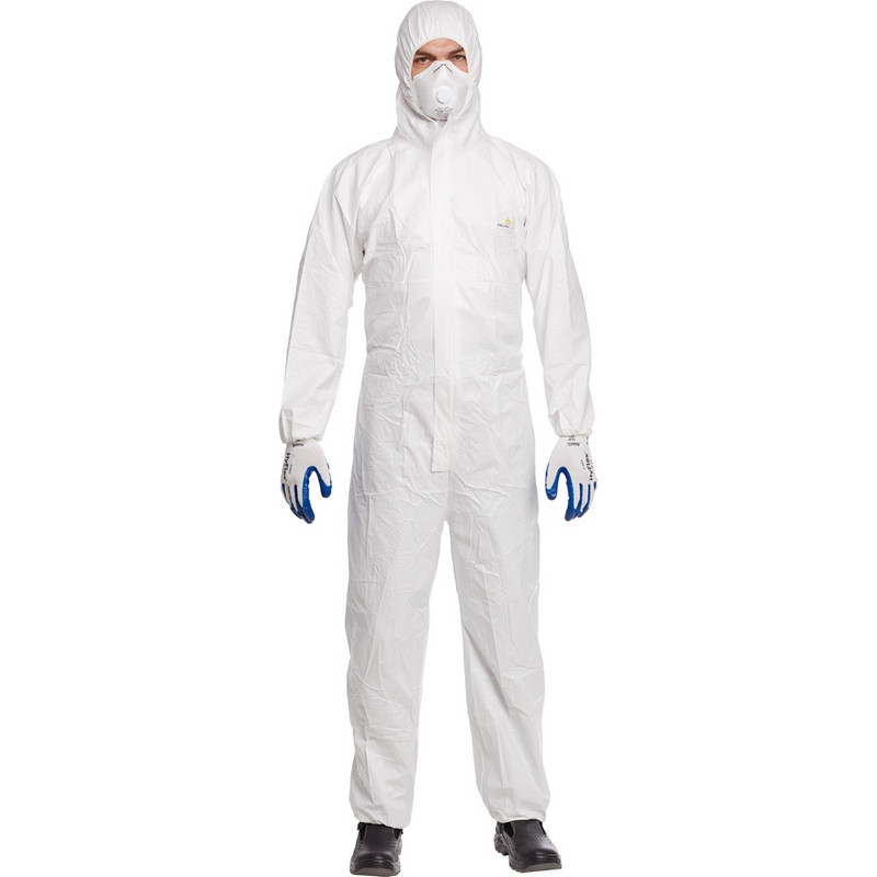 Одноразовый комбинезон изготовлен из нетканого микропористого и ламинированного материала Deltatek 5000 (70% полипропилен, 30% полиэтилен). Обеспечивает хорошую паро-воздухопроницаемость. Модель обладает хорошими свойствами, качественная. Застежка-молния, закрытая защитной планкой. Эластичная резинка вокруг лицевого выреза капюшона, на талии, манжетах рукавов и лодыжках. Прочная и эластичная ткань устойчивая к механическим воздействиям, плотность ткани составляет 60 г/м. Защита от твердых частиц, от брызг кислот, щелочных веществ и воды, антистатические свойства. Цвет: белый. ТР ТС 019/2011, EN ISO 13982-1 тип 5, EN13034 Тпи 6, EN1149-5. Область применения: малярные работы, пищевая промышленность, очистка производственных помещений и оборудования, утилизация и переноска асбеста, фармацевтическая промышленность, защита от лёгких брызг невысокой опасности и опасных сухих частиц, монтаж изоляции, дерево и металлообработка, общее промышленное применение. Размер: 52-54 (XL), рост 180-188.