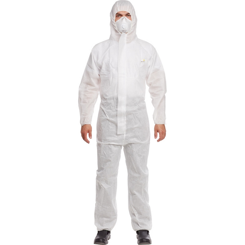 Одноразовый комбинезон изготовлен из дышащего материала полипропилена, обеспечивает хорошую паро-воздухопроницаемость, не образует ворса. Модель из нетканого материала обладает хорошими свойствами, качественная. Центральная молния закрыта планкой, эластичный капюшон с резинкой вокруг лица. Такие же резинки располагаются на талии и внизу брюк. Данная модель не сковывает движения, удобна в носке и безупречно защищает благодаря качественному материалу. Прочная и эластичная ткань устойчивая к механическим воздействиям, плотность ткани составляет 50 г/м. Комбинезон с капюшоном на застежке-молнии. Лицевой вырез капюшона, пояс, низ рукавов и брюк стянуты резинкой. Цвет: белый. ТР ТС 019/2011, EN ISO 13982-1 тип 5, EN13034 тип 6. Область применения: малярные работы, пищевая промышленность, очистка производственных помещений и оборудования, утилизация и переноска асбеста, фармацевтическая промышленность, защита от лёгких брызг невысокой опасности и опасных сухих частиц, монтаж изоляции, дерево и металлообработка, общее промышленное применение. Размер 46-48 (M), рост 164-172.
