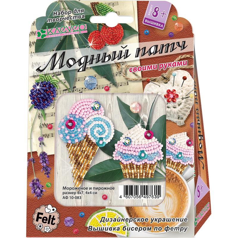 Набор для изготовления украшения-патча Мороженое и пирожное - это модный изысканный патч своими руками! Стилизованные фигурные украшения из бисера нежных цветов в виде пирожного со взбитым воздушным кремом и сахарного рожка с шариками разноцветного мороженого. Патчи просты в исполнении - нужно вышить фетр нитями с бисером и стеклярусом по инструкции с несложными схемами, вырезать изделия по контурам, нашить в нужных местах пайетки с бисеринами и прикрепить к одежде или сумке. В наборе: фетр, бисер, стеклярус, пайетки, нить, бисерная игла, шаблон-выкройка, пошаговая инструкция. Размер упаковки: 110х155х29 мм.