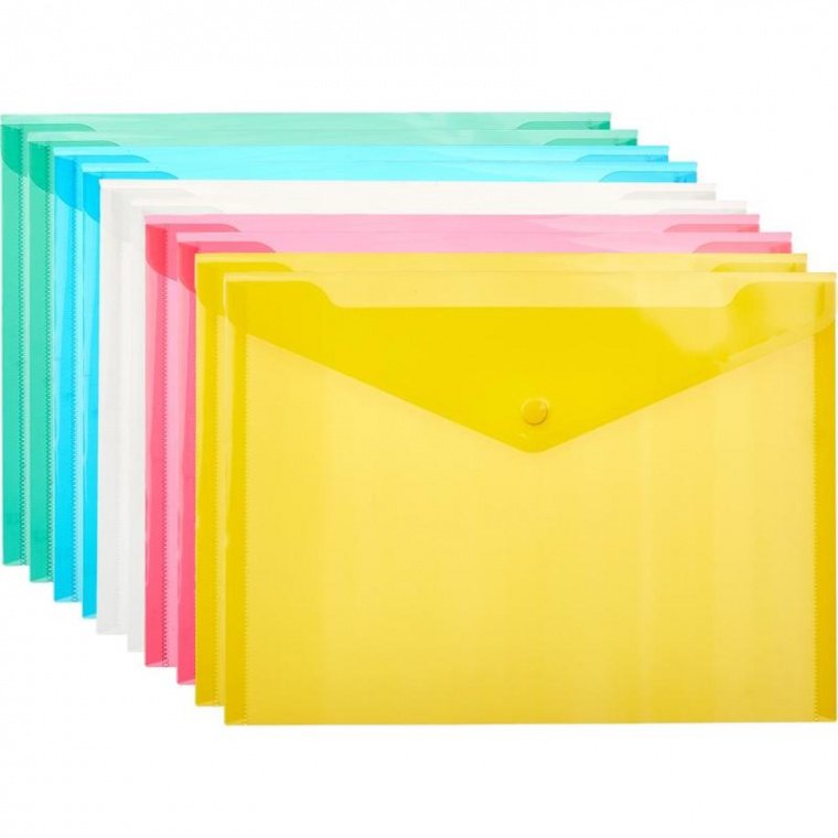 Папка-конверт размером формата В5 изготовлена из прозрачного пластика толщиной 0,18 мм. Закрывается на кнопку. Вмещает до 120 листов. Удобна для хранения и переноски документов, предотвращает их смятие и загрязнение. Размер: 209×282 мм.