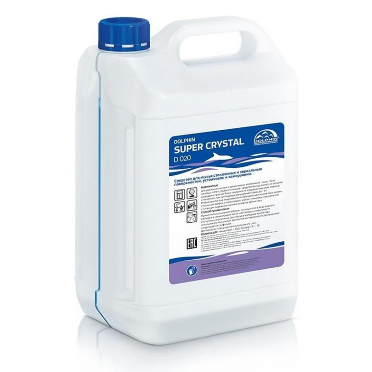 Средство для мытья стеклянных и зеркальных поверхностей, устойчивое к замерзанию Dolphin Super Crystal D020 5 лНазначение: для удаления уличных и органических загрязнений — пыли, грязи, жировых пятен, следов от пальцев. Область применения: рекомендуется для ежедневного и периодического мытья окон, витрин, стеклянных дверей и перегородок, зеркал, глянцевых поверхностей, а также для наружного мытья в холодное время года. Свойства: средство быстро сохнет, не оставляя разводов и придает блеск поверхности. Сохраняет высокую моющую способность при температуре окружающей среды до −3 градусов. Способ применения: используется в виде водного раствора в концентрации 10-15 мл / 1 л воды, в зависимости от степени загрязнения. Для мытья в холодное время года использовать концентрат. Наносится на поверхность распылением и протирается салфеткой. Для больших поверхностей использовать сгон. Применяется для ручной уборки.Состав: изопропиловый спирт 15-30%, неионогенные ПАВ 0-5%, соли НТА 0-5%, отдушка, красители, консерванты.ГОСТ/ТУ: ТУ 2383-002-85522504-2011.Плотность: 0,96 г/куб.см. при 20°С.Значение pH 1%-раствора: 7,5.Меры предосторожности (подробная информация см. паспорт безопасности): не принимать внутрь. Не смешивать с другими средствами, перед применением прочесть инструкцию. Использовать перчатки. При попадании на кожу или в глаза промыть большим количеством воды. При необходимости обратиться к врачуУсловия хранения: Хранить в заводской упаковке при температуре 5-25°С. Не допускать замораживания и попадания прямых солнечных лучей. Хранить в местах недоступных для детей, вдали от пищевых продуктов.Срок годности: 24 месяца (с даты производства).