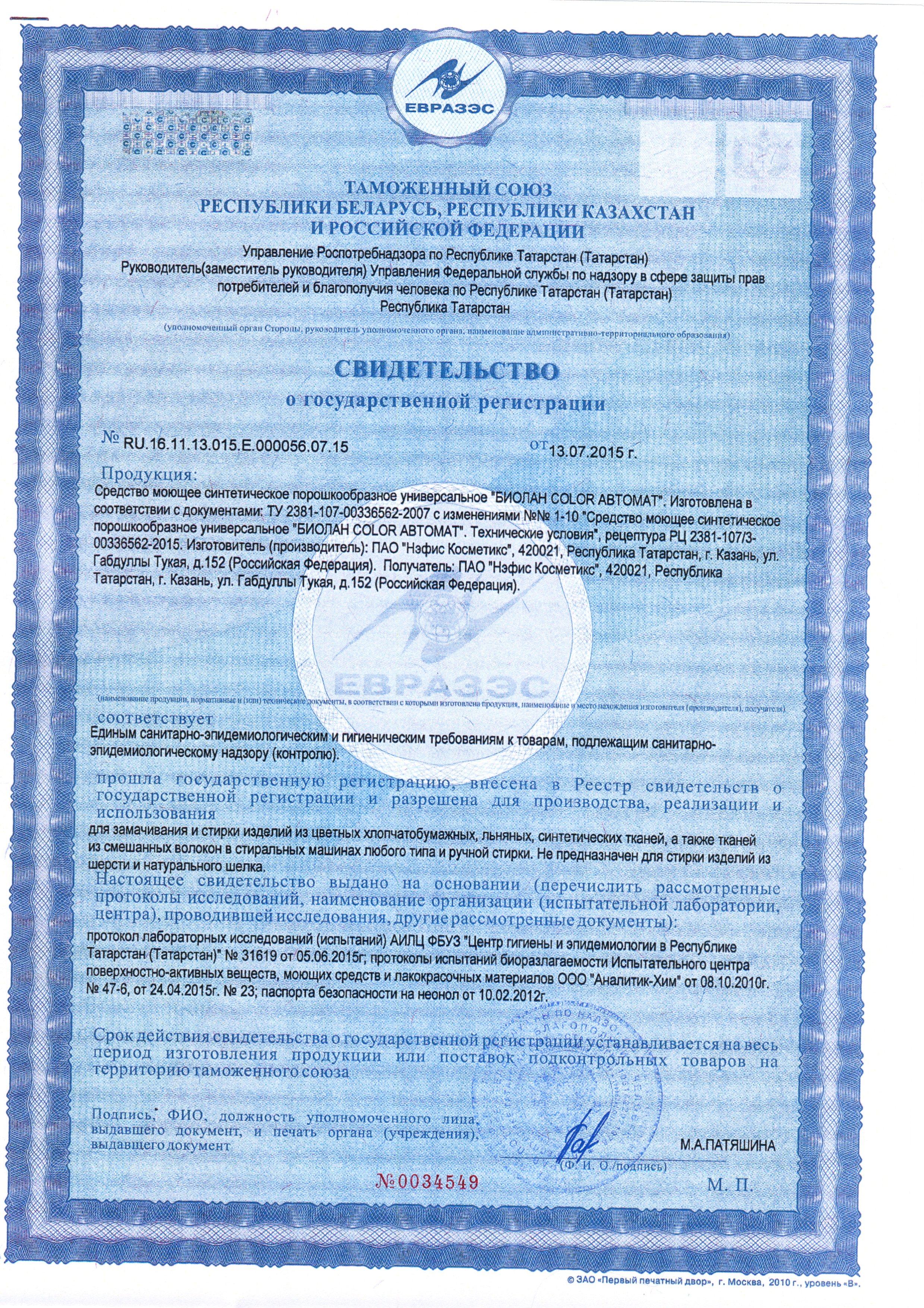 Сертификат на товар - Порошок стиральный автомат Биолан Color 20 кг
