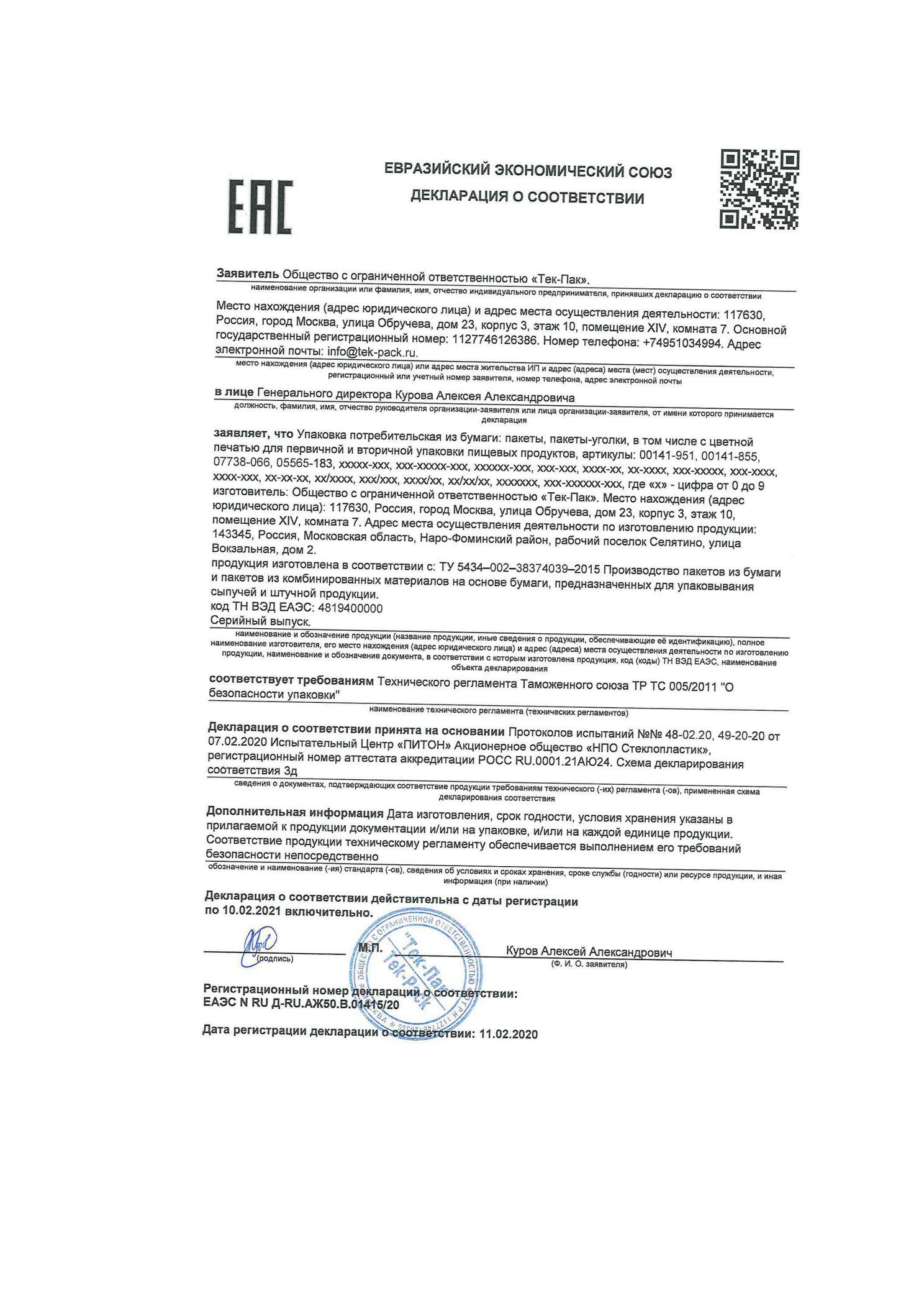 Сертификат на товар - Крафт пакет жиростойкий коричневый с крученными ручками 26х35 см 200 штук
