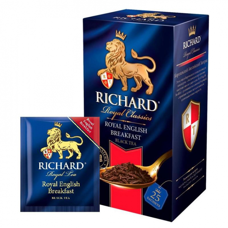 Чай Richard Royal English Breakfast черный 25 пакетиков — изысканный купаж элитных сортов черного цейлонского, индийского и кенийского чая. Фасовка — 25 сашетов по 2 грамма, пачка с обзорным окном, через которое пакеты легко доставать из пачки.