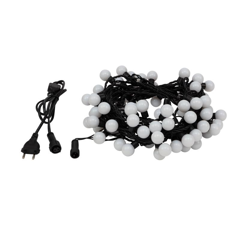 Гирлянда Мультишарики, предназначенная для размещения вне помещения, представляет собой электрический шнур, на котором располагаются яркие светодиодные лампы, изготовленные в виде шариков. Светодиоды по сравнению с миниатюрными лампами накаливания имеют целый ряд существенных преимуществ. Их отличает чистое и яркое свечение, огромный ресурс, прочность, незначительное потребление энергии, надежность. Такая гирлянда позволяет получить неповторимые светодинамические картины, коренным образом отличающиеся от существующих сегодня типов световых эффектов. Гирлянда великолепно подходит для украшения помещений, интерьерных елок, превращая их в настоящие произведения искусства. Гирлянда выполнена в виде линии расположенными на них 80 светодиодами. Светодиоды более надежны, экономны и не нагреваются. Диаметр шариков 23 мм. Режимы свечения: 1. Постоянное свечение. Технические характеристики: - Температурный режим: от -20 до +40 °C; - Длина гирлянды: 10 м; - Длина шнура: 1,5 м; - Питание: от сети 220 В. Товар имеет степень защиты IP65 - корпус с полной защитой от проникновения пыли и защита от сильных струй воды. Можно соединять до 200 м.
