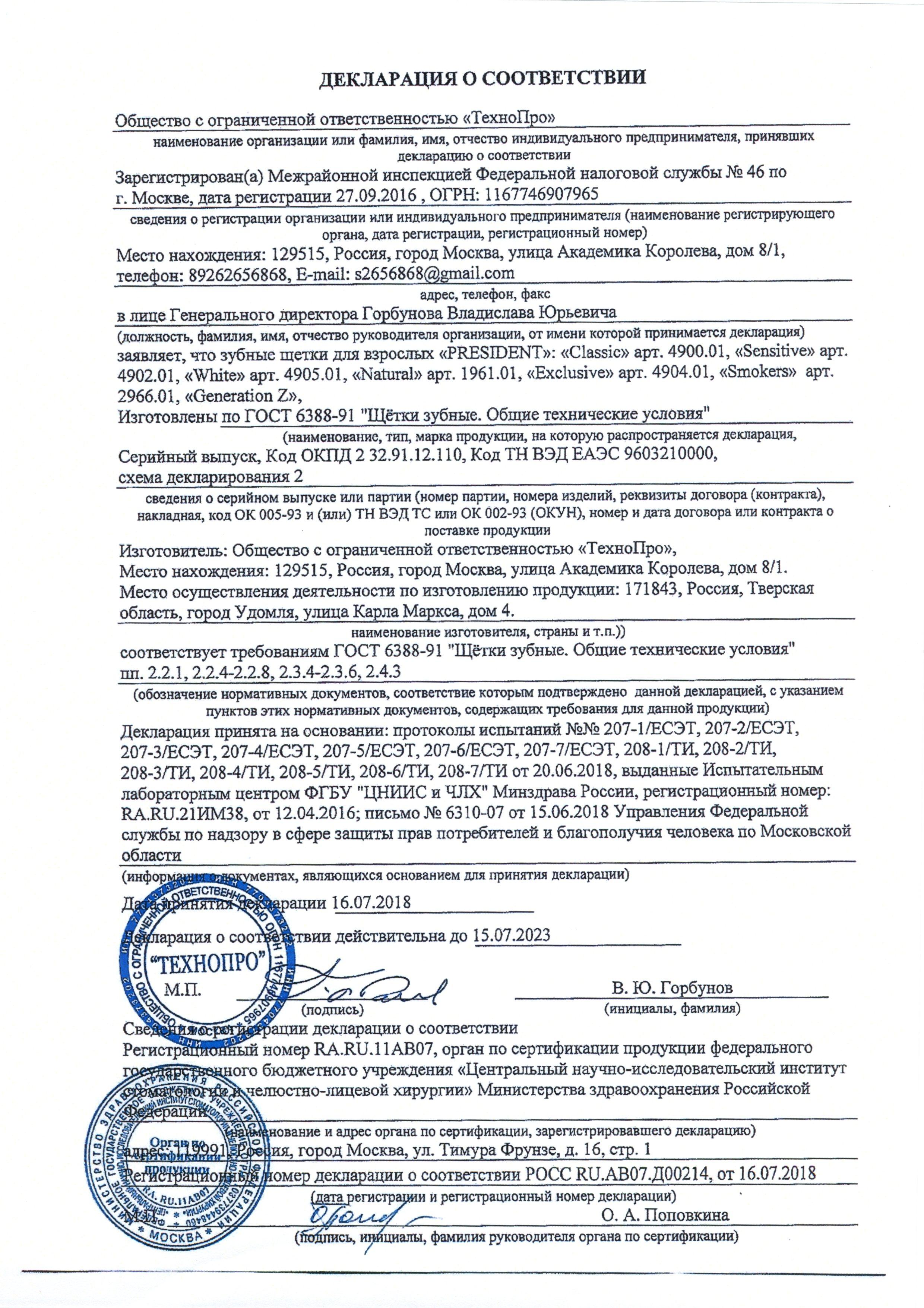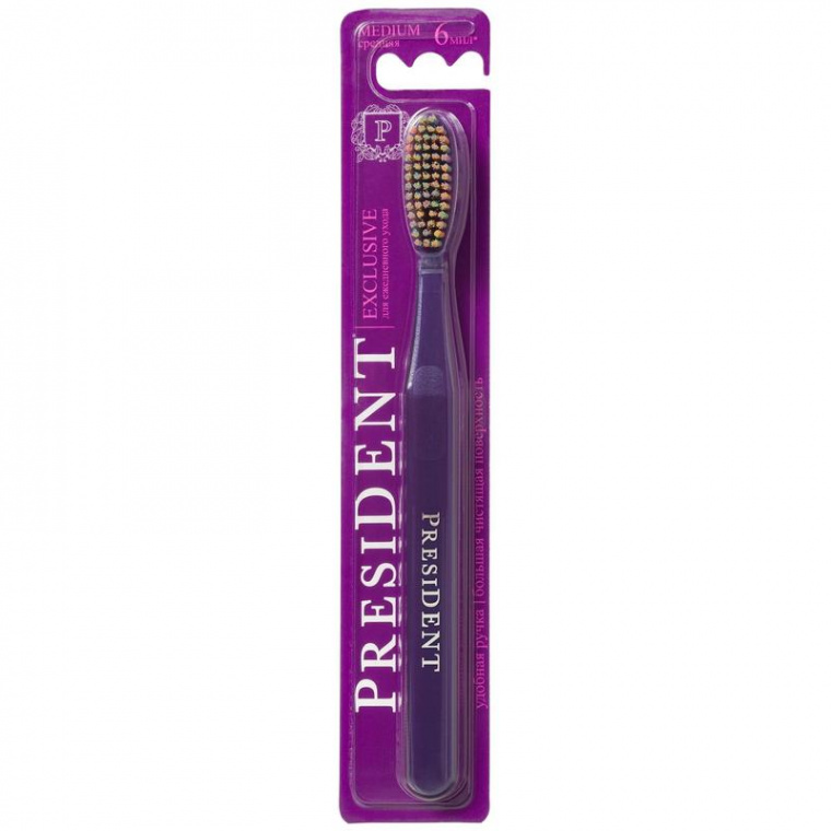 Зубная щетка President Exclusive с радужной щетиной для ежедневного использования. Показатель жесткости: 6 мил (medium). Большая головка обеспечивает быстрое очищение внешних, внутренних и жевательных участков зубного ряда. Закругленные нейлоновые щетинки Medex деликатно полируют зубную эмаль и не травмируют десны. Позволяет эффективно очищать зубной налет, а также предотвращает образование зубного камня.