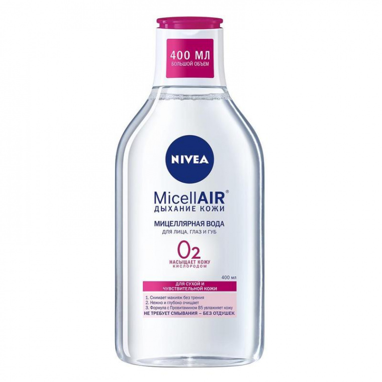 Мицеллярная вода Nivea MicellAir (400 мл) подходит для сухой и чувствительной кожи. Удаляет макияж с лица и глаз и губ, глубоко очищает и ухаживает за кожей, насыщая ее кислородом. Не содержит парабенов, силикона и отдушек. Не требует смывания.