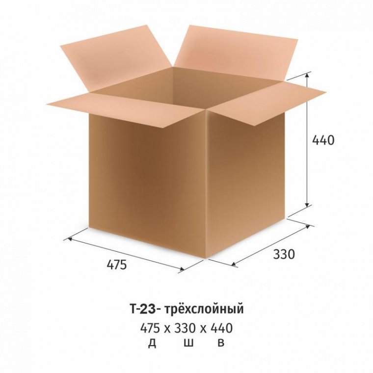 Короб картонный 475×330×440 мм Т-23 10 штук в упаковке Универсальный четырехклапанный короб для упаковывания. Предназначен для упаковывания, хранения и транспортировки различных грузов с защитой от ударов и влаги. Подходит как для упаковки бытовой химии, так и пищевых продуктов. В пустом виде картонный гофрокороб легко и удобно складывается. Выполнен из трехслойного гофрокартона марки Т-23 бурого цвета. Гофрокартон имеет профиль «C». Размеры (ДxШxВ) — 475×330×440 мм (68,97 литра).