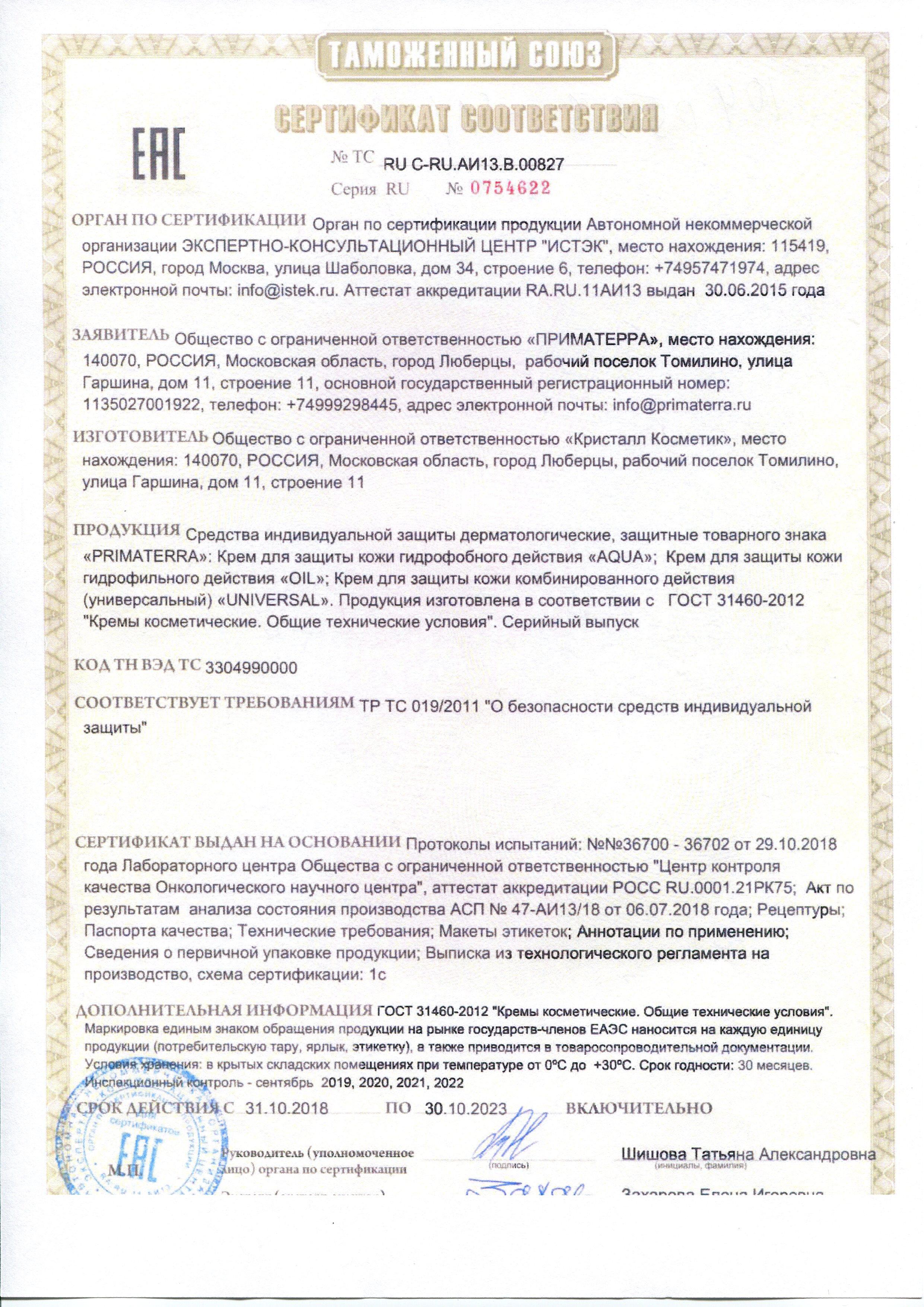 Крем защитный Primaterra Aqua для рук гидрофобный 100 мл предназначен для эффективной защиты кожи при постоянных контактах с водой или водосодержащими рабочими веществами: различными кислотами, щелочью, солями, синтетическими моющими и дезинфицирующими средствами, органическим спиртом, смазочно-охлаждающими и тормозными жидкостями, цементом, бетоном, глиной, известью, тосолом, фенолом, щелочно-масляными эмульсиями и другими водорастворимыми загрязняющими веществами. Обладает высокой водоотталкивающей способностью (тип эмульсии: вода в масле). Такой вид эмульсии более физиологичен, т.к. при нанесении диспергированная вода впитывается, и на коже остается тончайший масляный барьер, родственный липидам кожи. Обратная эмульсия трудно смывается водой, препятствует потери кожных липидов. Обеспечивает лучшую защиту, создает дополнительный барьерный слой, уменьшая испарение влаги из глубинных слоев кожи.