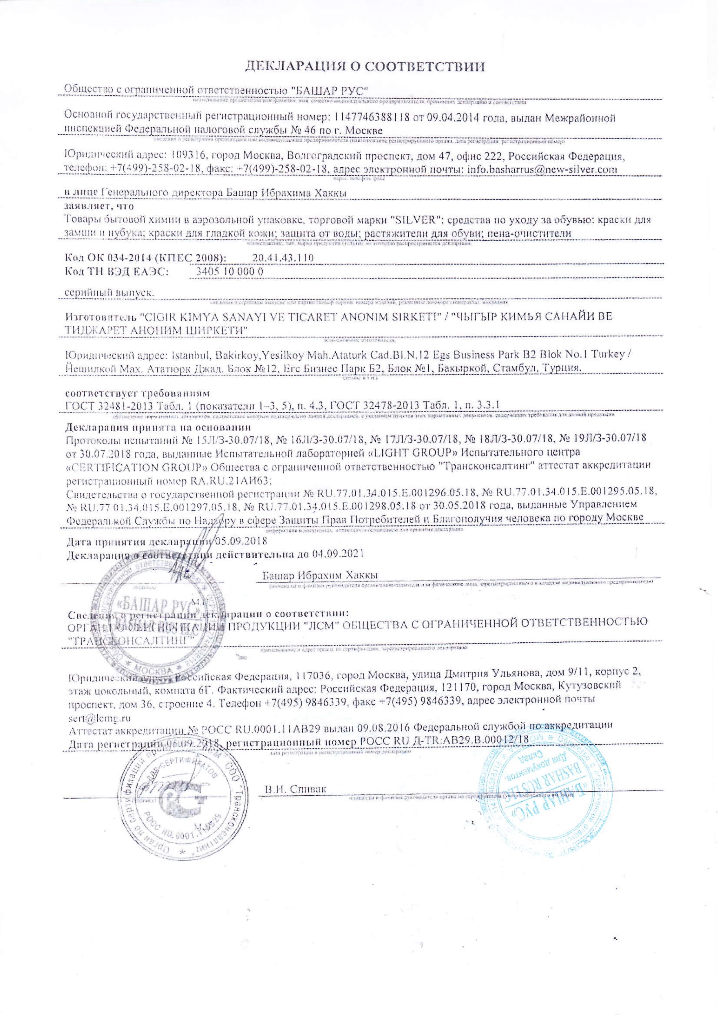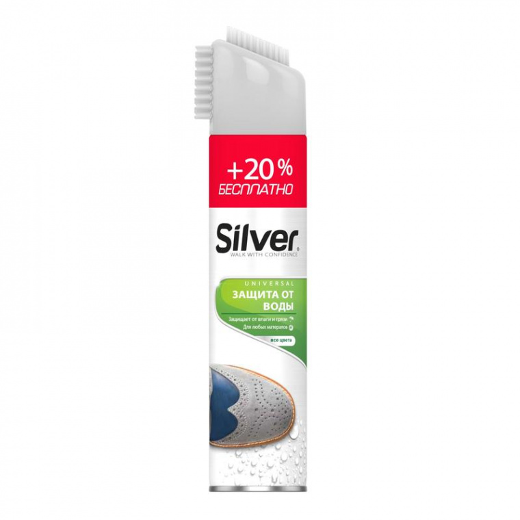 Универсальный водоотталкивающий спрей Silver — защита от воды для всех типов цветов обуви, пальто, сумок и других аксессуаров из кожи, замши, нубука и ткани. Обеспечивает длительную защиту от влаги, дождя и снега. Препятствует образованию масляных пятен и водяных разводов. Способ применения: очистите поверхность изделия щеткой расположенной на крышке флакона. Встряхните баллон. Распылите средство по поверхности сухого изделия с расстояния 15-20 см, держа баллон вертикально распылителем вверх. Дайте высохнуть.