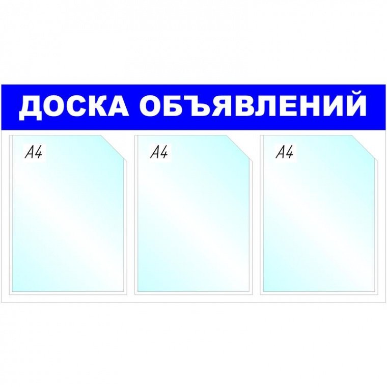 Информационный стенд на 3 плоских кармана под лист формата А4. Шапка «Доска объявлений» синего цвета, буквы белые.