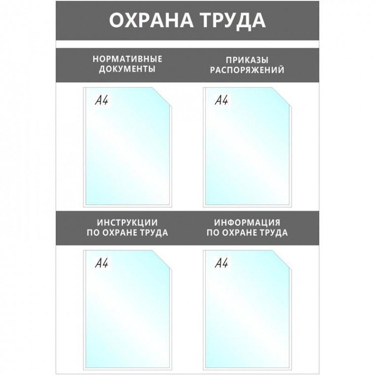 Информациоонный стенд Охрана труда на 4 плоских кармана под лист формата А4 с дополнительными надписями. Основание стенда ПВХ 4 мм., заголовки - ПВХ плёнка серого цвета, плоские карманы под лист формата А4 изготовленны из ПЭТ 0.5 мм. Крепление стенда к стене по четырем углам, набор крепежа (4 самореза) в комплекте. Упаковка - гофрокартон.