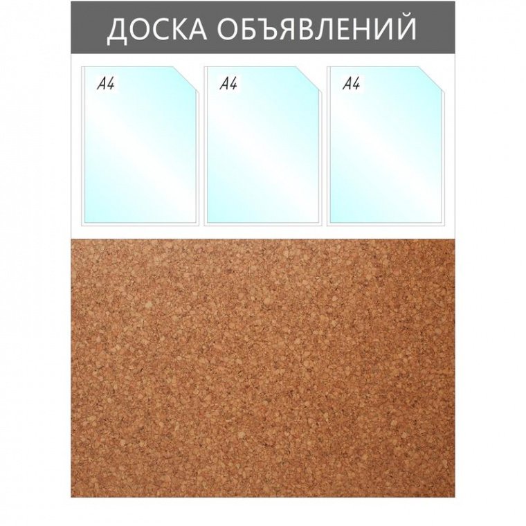 Информациоонный стенд «Доска объявлений» комбинированный, на 3 плоских кармана под лист формата А4 и пробковым покрытием.