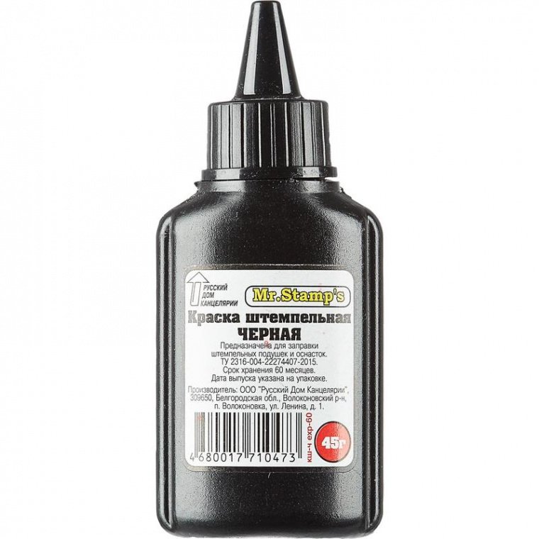 Краска штемпельная РДК на водной основе. Флакон объемом 45 г. Цвет черный. Флакон снабжен дозатором, обеспечивающим равномерное нанесение краски на подушку.