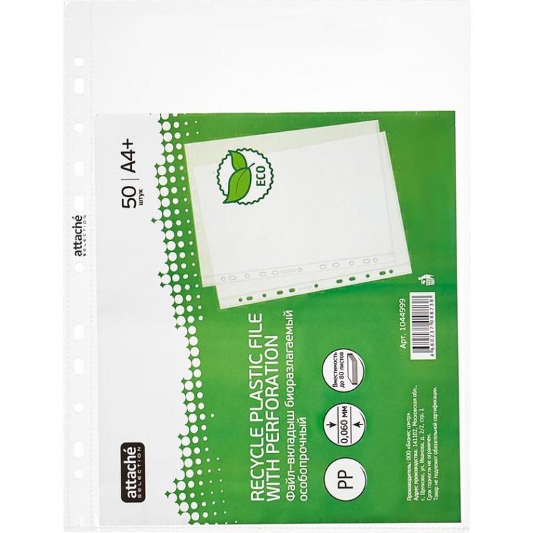 Файл-вкладыш Attache Selection формата А4 предназначен для хранения и защиты документов. Подходит для подшивки в папки с любым кольцевым механизмом и скоросшивателем. Внутренний размер — 306×218 мм. Изготовлен из биоразлагаемого полимера.
