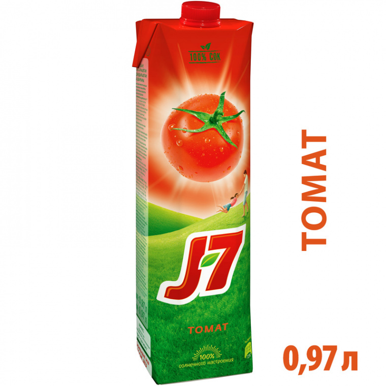 Сок J7 томат с мякотью 0.97 л. Сок J7, изготовленный из томатов с добавлением соли. Налит в практичный картонный пакет объемом 0.97 л с винтовой крышкой. Может быть использован как в качестве самостоятельного напитка, так и в составе различных коктейлей. После вскрытия упаковки рекомендуется краткосрочное хранение в холодильнике.