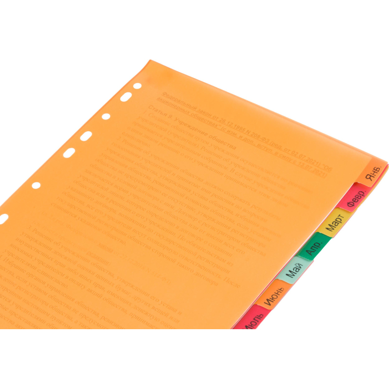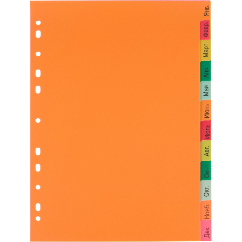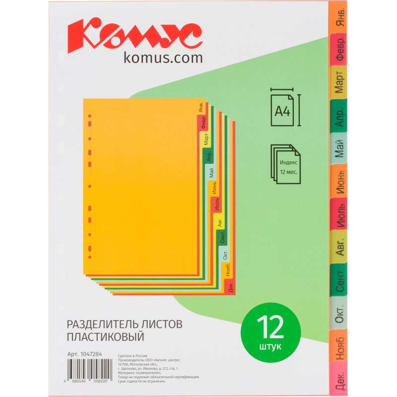 Разделители - это отличный вариант для систематизации документов внутри папок разного вида. Они помогают сортировать информацию в том виде, как нужно именно Вам. Разделители листов Комус формата А4 цветные, облегчающие систематизацию архивных и текущих документов. Размер - 290x210 мм. Выполнены из прочного пластика толщиной 150 мкм. Имеют универсальную перфорацию для подшивки в папки. Разделители листов включают индекс по месяцам (12 разделов).