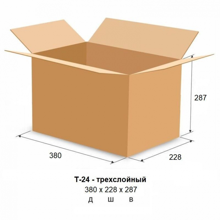 Короб картонный 380×228×287 мм Т-24 20 штук в упаковке Универсальный четырехклапанный короб для упаковывания. Предназначен для упаковывания, хранения и транспортировки различных грузов с защитой от ударов и влаги. Подходит как для упаковки бытовой химии, так и пищевых продуктов. В пустом виде картонный гофрокороб легко и удобно складывается. Прочный, упругий, обладает хорошими амортизирующими свойствами, отлично переносит штабелирование, высокое сопротивление проколам. Легко складывается. Выполнен из трехслойного гофрокартона марки Т-24 бурого цвета. Гофрокартон имеет профиль «В». Размеры (ДxШxВ) — 380×228×287 мм (24,87 литра).