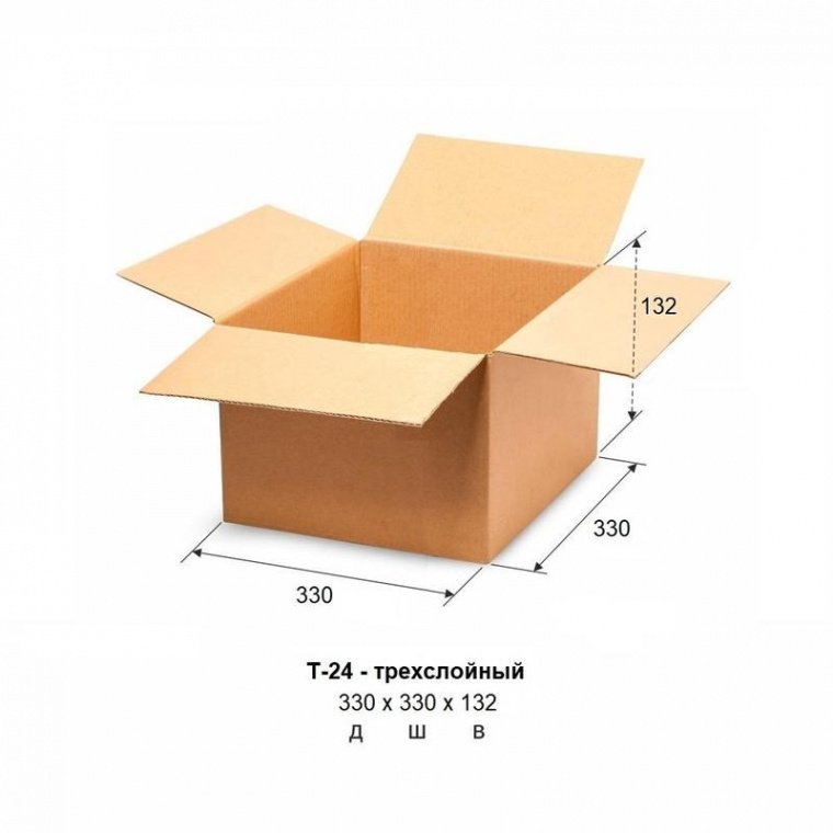 Короб картонный 330×330×132 мм Т-24 20 штук в упаковке Универсальный четырехклапанный короб для упаковывания. Предназначен для упаковывания, хранения и транспортировки различных грузов с защитой от ударов и влаги. Подходит как для упаковки бытовой химии, так и пищевых продуктов. В пустом виде картонный гофрокороб легко и удобно складывается. Прочный, упругий, обладает хорошими амортизирующими свойствами, отлично переносит штабелирование, высокое сопротивление проколам. Легко складывается. Выполнен из трехслойного гофрокартона марки Т-24 бурого цвета. Гофрокартон имеет профиль «В». Размеры (ДxШxВ) — 330×330×132 мм (14,37 литра).