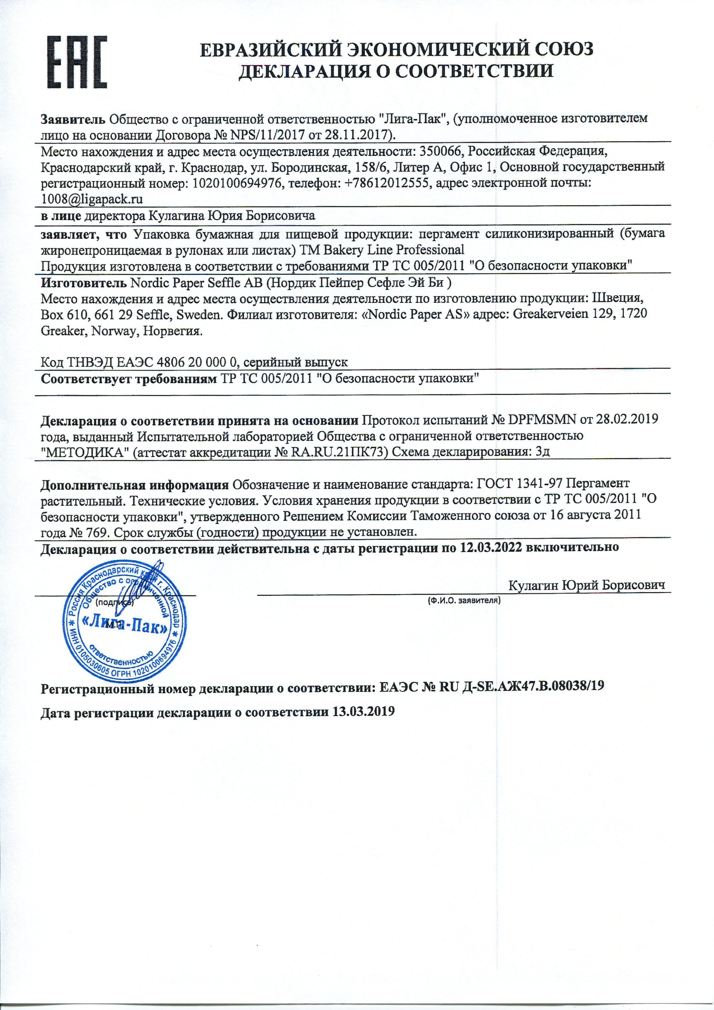 Сертификат на товар - Пергамент для выпечки Комус белый силиконизированный 40 x 60 см (500 листов)