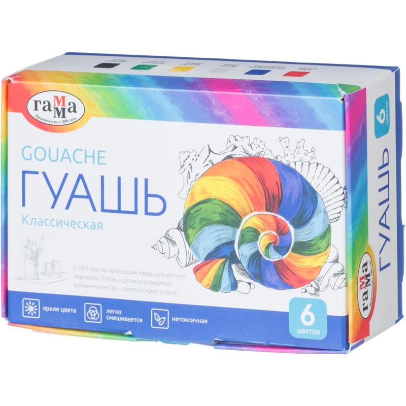 Гуашь 'Гамма. Классическая' предназначена для детского творчества. Краски производятся на основе качественного, прозрачного связующего вещества, чтобы сохранить чистоту цветов. Она хорошо смешивается, а при высыхании даёт бархатистый матовый эффект. Гуашь находится в пластиковых герметичных баночках с завинчивающейся крышкой. В набор входит 6 цветов: белый, желтый, алый, зеленый, ультрамарин, черный. Краски упакованы в цветную картонную коробку, размер упаковки (ДxШxВ): 77x115x40 мм. Объем одной баночки - 20 мл. Поставляется без кисти.