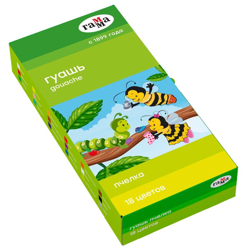 Гуашь 'Гамма. Пчелка' предназначена для детского творчества, выполнения художественно-декоративных работ, оформительских работ. Яркие и насыщенные цвета позволяют реализовать самые смелые творческие идеи, а также развивают фантазию. Плотная текстура гуаши идеально подходит для смешивания. В набор входит 18 цветов: белый (2 баночки), желтый, оранжевый, алый, рубиновый, розовый, охра, желто-зеленый, зеленый, бирюзовый, синий темный, ультрамарин, красно-фиолетовый, фиолетовый, коричневый, черный, серый. Краски упакованы в картонную коробку, размер упаковки (ДxШxВ): 223x115x 40 мм. Объем одной баночки - 20 мл. Поставляется без кисти.