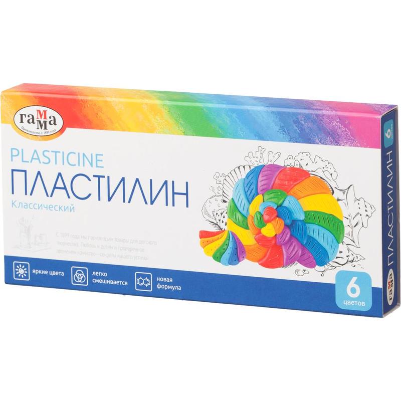Пластилин 'Гамма. Классическая' предназначен для лепки и моделирования. Лепка из пластилина не только доставляет удовольствие, но и способствует снятию мышечного и психического напряжения, развитию мелкой моторики рук и пространственного мышления. В серии используются современные светостойкие пигменты, обеспечивающие более яркие и сочные цвета. Цвета легко смешиваются. Пластилин не липнет к рукам, не оставляет жирных пятен. При разминании пластилин становится эластичным, не рвется на фракции при многократном сгибании, позволяет лепить тончайшие детали. Хорошо держит форму и долго сохраняет цвета. В комплекте идет пластиковый стек. Набор включает 6 цветов: белый, желтый, алый, зеленый, синий, черный.