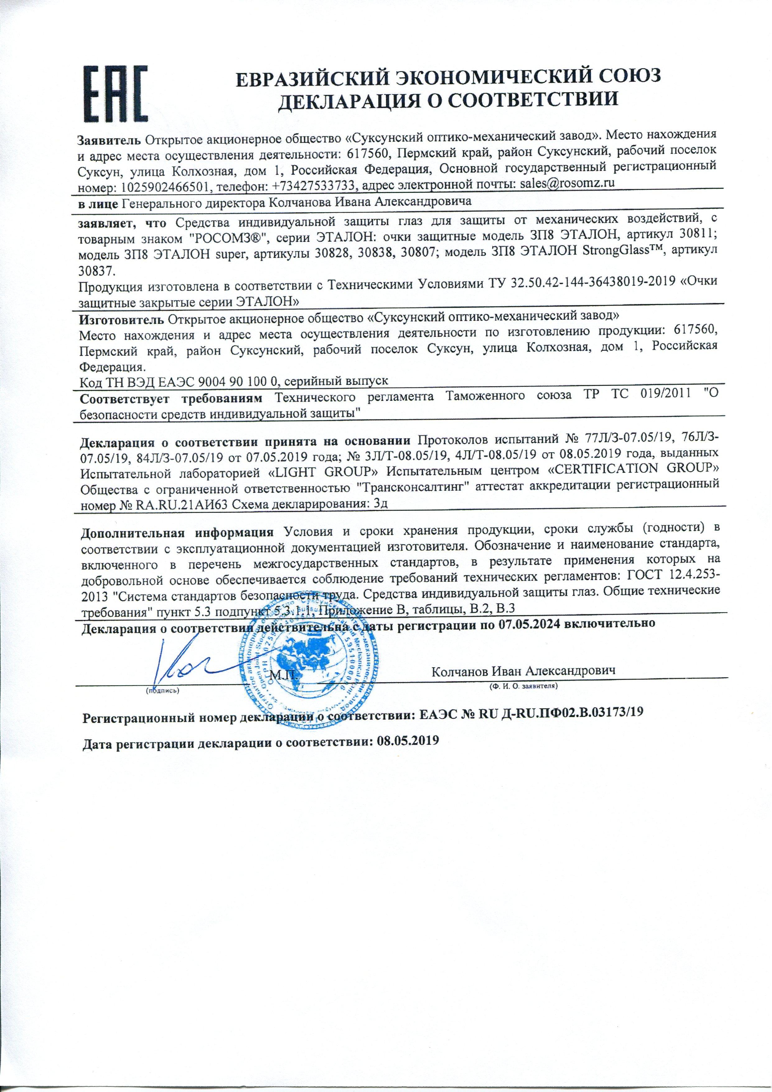 Сертификат на товар - Очки защитные закрытые универсальные РОСОМЗ ЗП8 Эталон прозрачные (30811)