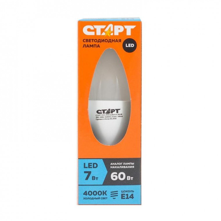 Светодиодная лампа СТАРТ применяется для эффективной замены ламп накаливания в помещениях для основного или декоративного освещения. Подходит для большинства осветительных приборов, укомплектованных цоколем Е14. Свет от источника освещения ровный и теплый. Плафон лампы выполнен в форме свечи и может выступать дополнительным элементом для декорирования. Конструкция лампы герметична, ее работа не зависит от температурных изменений. Свет от лампы на уровне 4000К — естественный белый, приятный для глаз. Низкое энергопотребление лампы на уровне 7Вт соответствует 60Вт от стандартной лампы накаливания. Использование светодиодов обеспечивает экономию по энергозатратам до 90% по сравнению с обычными аналогами. Срок службы элемента освещения составляет 15 000 часов. Встроенные микроконтроллеры исключают перегрев лампы и замыкание вследствие перепадов напряжения. Корпус изготовлен из нетоксичных материалов, соответствующих стандартам по использованию данного типа ламп в жилых помещениях. Утилизация и переработка элемента освещения не наносит ущерба окружающей среде.