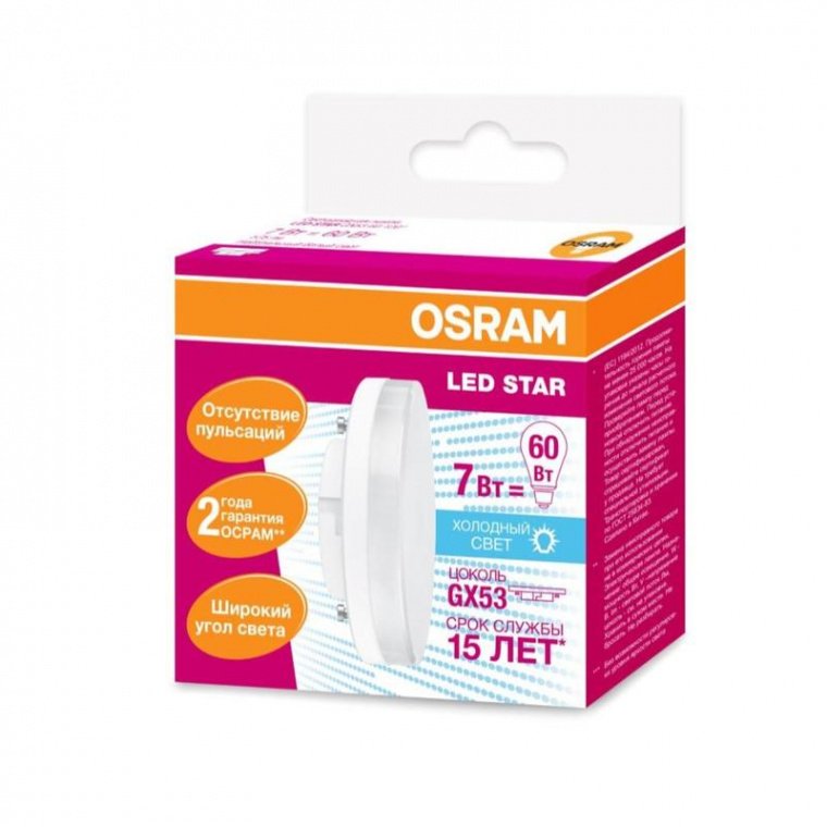 Лампа светодиодная Osram GX53 7 Вт (60 Вт) 4000 К излучает нейтральный белый свет.